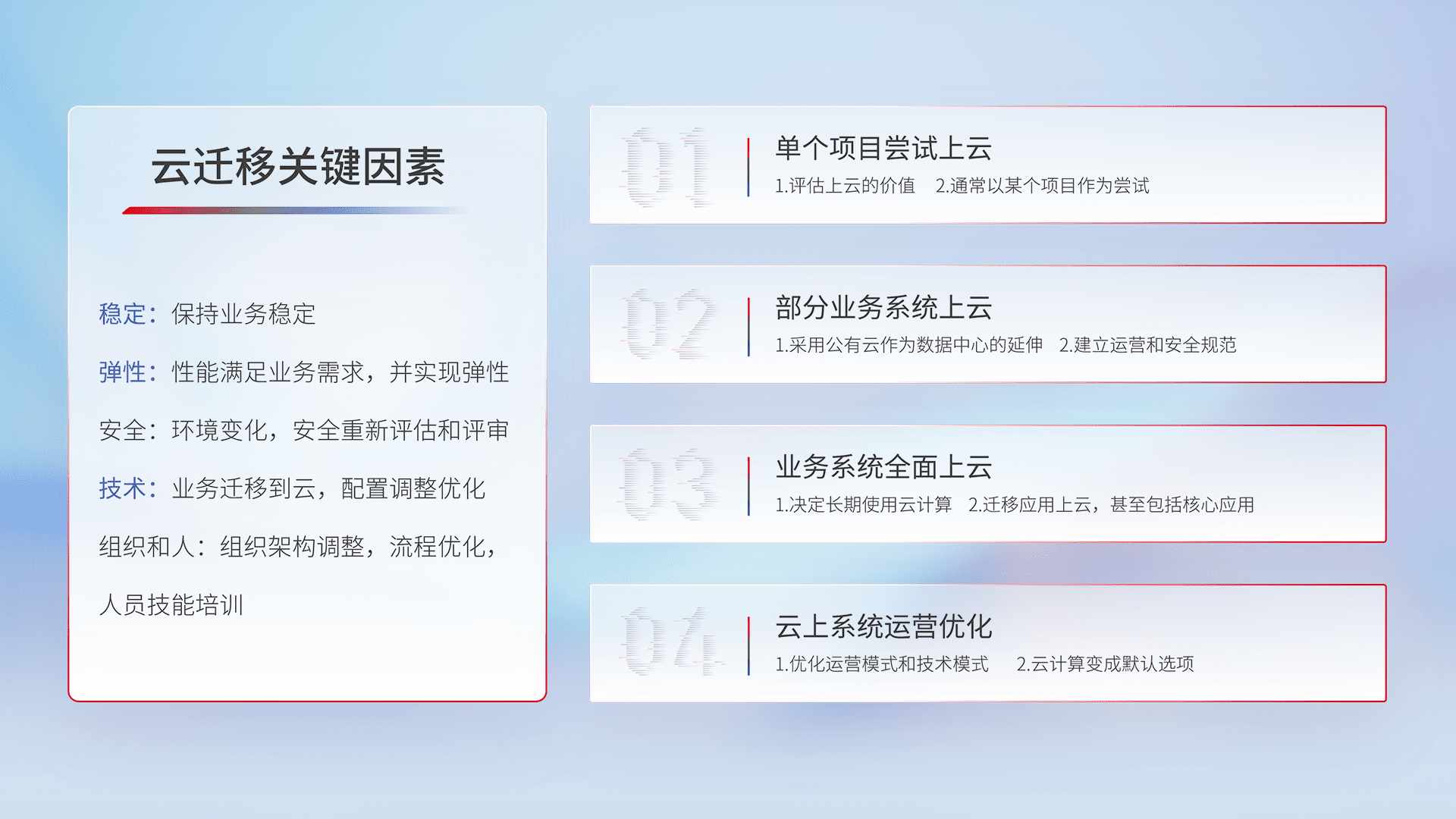 结合实际业务,,从规划设计、、、云平台选型、、、云原生改造、、、数据迁移、、集成交付,,,迁移全过程为客户识别最佳上云路径,,,,做好风险识别管理,,设计网络架构、、、、身份权限、、安全审计合规、、操作审计、、、日志审计、、监控告警策略、、多站点容灾设计等,,,对云上基础设施进行整体规划,,,,提升IT治理水平,,,,以满足弹性、、、、高可用、、、、高性能的需求。。。