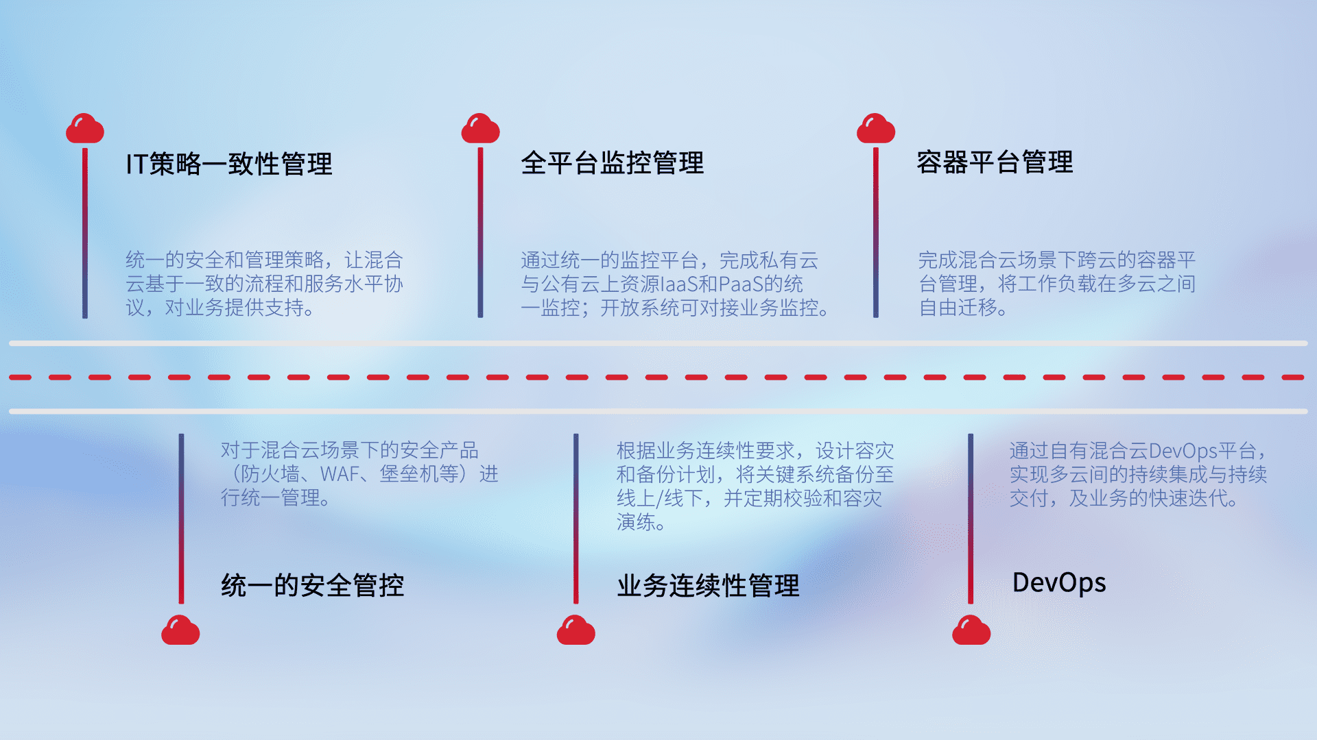 通过多云纳管,,,以统一的资源数据模型把客户的云资源进行抽象和封装,,,进而实现对多云资源的统一操作,,保障云资源管理的可靠性、、、稳定性与可用性。。。量身定制化运维内容,,,,配置、、、、开发运维、、补丁管理、、、、备份、、、、监控、、认证和访问管理、、、审计和日常巡检等,,,保障在用云过程中的可靠度,,,,稳定度以及高可用率。。