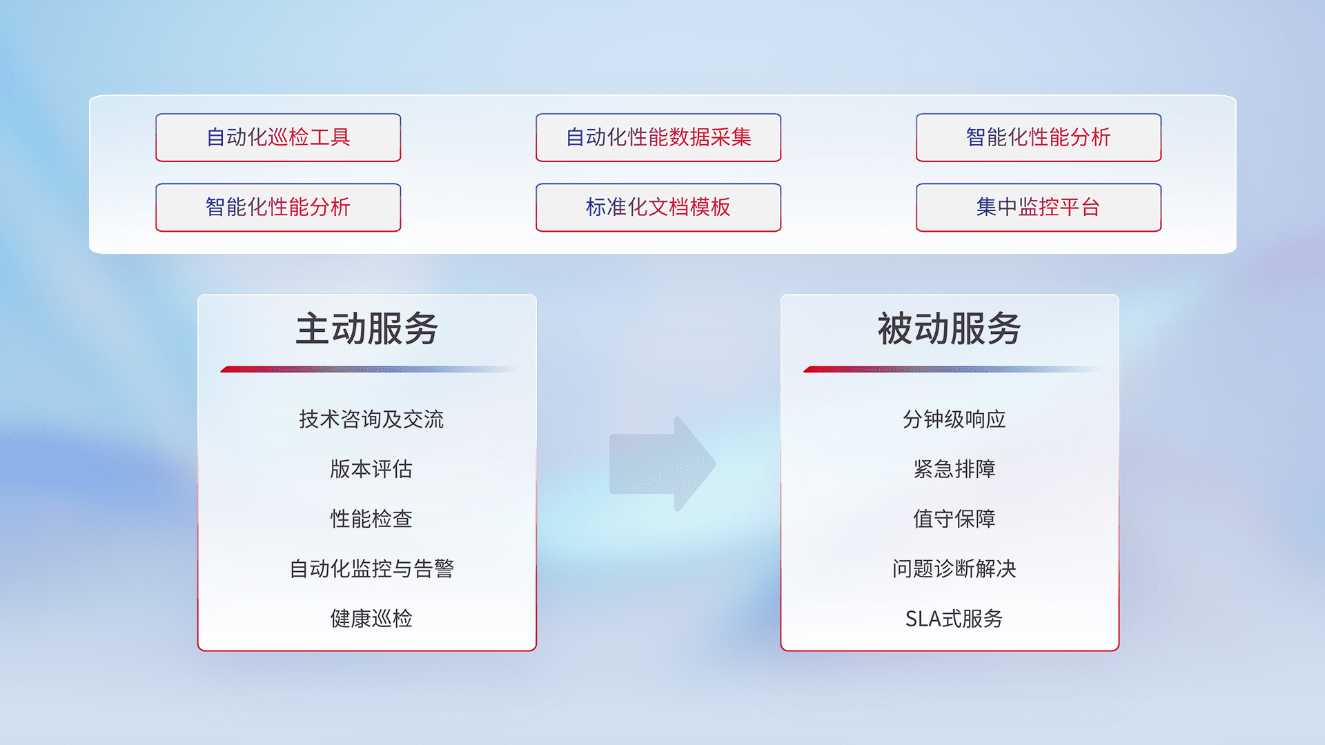 智能化工具和标准化文档,,,,保障服务质量,,提供主动服务(包含技术咨询、、、、版本评估、、、、性能检查、、自动化监控与告警、、健康巡检)和被动服务包含(分钟级响应、、紧急排障、、、、值守保障、、、、问题诊断解决、、、SLA服务)。。。。